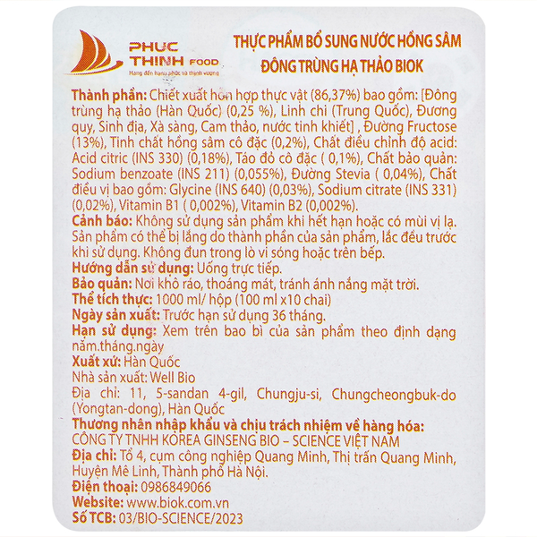 Chiết xuất hỗn hợp thực vật (86,37%) bao gồm: [Đông trùng hạ thảo (Hàn Quốc) (0,25 %), Linh chi (Trung Quốc), Đương quy, Sinh địa, Xà sàng, Cam thảo, nước tinh khiết] , Đường Fructose (13%), Tinh chất hồng sâm cô đặc (0,2%), Chất điều chỉnh độ acid: Acid citric (INS 330) (0,18%), Táo đỏ cô đặc ( 0,1%), Chất bảo quản: Sodium benzoate (INS 211) (0,055%), Đường Stevia ( 0,04%), Chất điều vị bao gồm: Glycine (INS 640) (0,03%), Sodium citrate (INS 331) (0,02%), Vitamin B1 ( 0,002%), Vitamin B2 (0,002%).