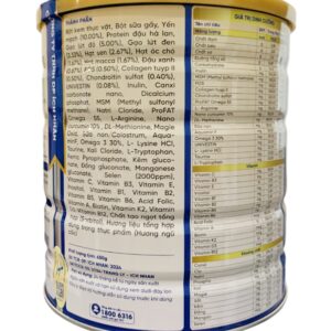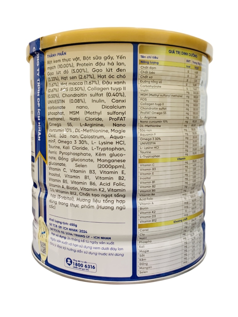 Bột kem thực vật, Bột sữa gầy, Yến mạch (10.00%), Protein đậu hà lan, Gạo lứt đỏ (5.00%), Gạo lứt đen (3.33%), Hạt sen (2.67%), Hạt óc chó (1.67%), Hạt macca (1.67%), Đậu xanh (0.67%), FOS (0.50%), Collagen tuyp II (0.50%), Chondroitin sulfat (0.40%), UNIVESTIN (0.08%), Inulin, Canxi carbonate nano, Dicalcium phosphat, MSM (Methyl sulfonyl methane), Natri Cloride, ProFAT Omega 55, L-Arginine, Nano curcumin 10% , DL-Methionine, Magie Oxid, Sữa non/Colostrum, Aquamin F, Omega 3 30%, L- Lysine HCl, Taurine, Kali Cloride, L-Tryptophan, Ferric Pyrophosphate, Kẽm gluconate, Đồng gluconate, Manganese gluconate, Selen (2000ppm), Vitamin C, Vitamin B3, Vitamin E, Inositol, Vitamin B1, Vitamin B2, Vitamin B5, Vitamin B6, Acid Folic, Vitamin A, Biotin, Vitamin K2, Vitamin D3, Vitamin B12, Chất tạo ngọt tổng hợp (Sorbitol), Hương liệu tổng hợp dùng trong thực phẩm (Hương ngũ cốc).